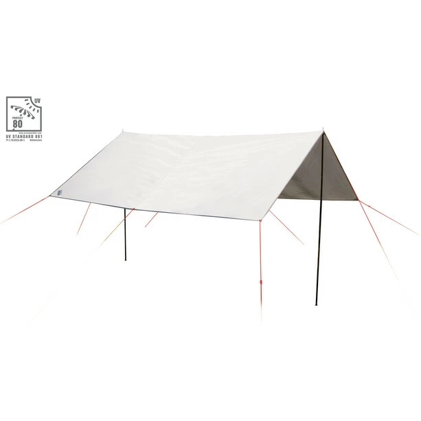 The Capri 3.0 awning by High Peak made of polyester is supplied with two steel rods of 180 cm each. 10 extra strong 5 mm pegs work even on hard ground. The 8 reinforced eyelets and the 10 guy ropes ensure a stable footing of the tarps. On the inside the sail is coated with aluminium. The Tarp offers a UV protection of 80 and can be easily stowed away in the supplied zip-lock carrying bag.