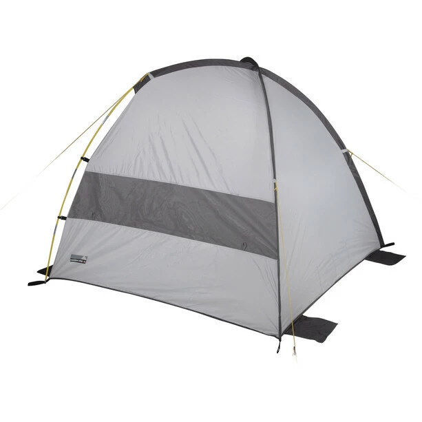 The free-standing beach tent Rapid Beach 80 impresses with its easy and quick assembly.The two poles of the same length make assembly easy and, thanks to the pole tunnels closed on one side, the set up is easy for one person. The new construction offers roomy space and shadow. The aluminium-coated outer material offers UV 80 protection (according to standard 801) The closable gauze areas ensure sufficient air circulation and prevent heat build-up in the beach shelter. If it is too windy or you want to protect yourself from prying eyes, you can simply close the gauze areas. Mesh organizers are used to store utensils. The four sand pockets secure the beach shelter on the beach and in strong winds the guy ropes with the supplied plastic pegs ensure a secure hold.