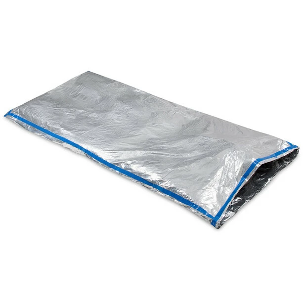 The foil material is also wind and waterproof. The packing bag is dimensioned so that the bivouac bag can be repacked there after use. The bivouac bag can be used several times during normal use. Therefore, sharp stones and strong tension on material and seams should be avoided. Tears or holes in the film can be taped.