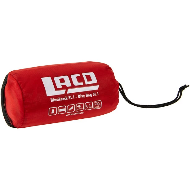The LACD bivouac bag Super Light is constructed of foil material and is therefore very light and compact. The polyethylene film, which is aluminium-vaporised on the inside, reflects a high proportion of body heat and thus keeps you warm. The film is taped.