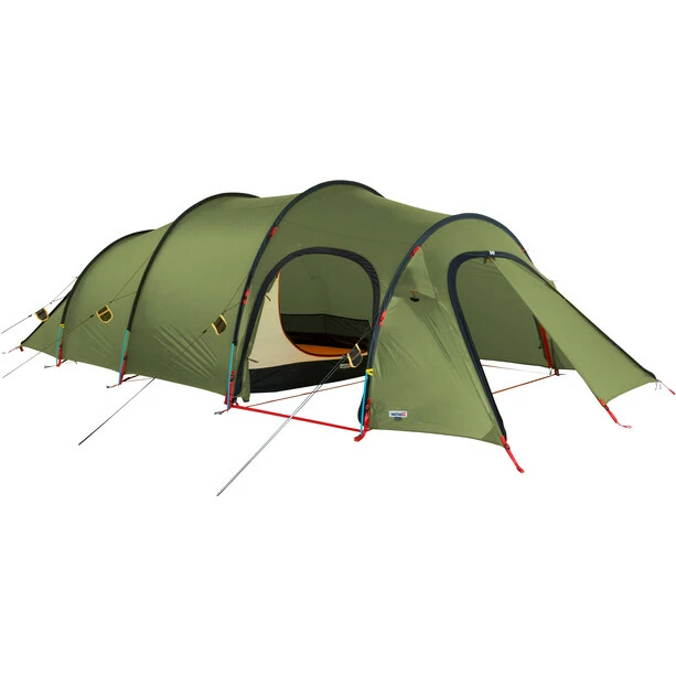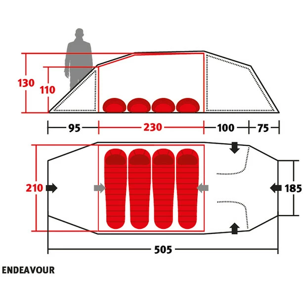 The Endeavor is an expedition-friendly four person tunnel tent, the outer tent can also be used individually as a small basecamp or kitchen tent. It has two protected inner tent entrances and very spacious apses in the front and rear part of the tent. The front vestibule can be opened over an all-round zipper, even if the entrance is partly snow-covered. Four large APEX ventilation flaps, which can be operated from the inside and can be completely closed, provide for a very good room climate. The rear, somewhat smaller apse can be opened by two side zippers. Here, too, the inner tent is protected by an open apse. If you are into the windiest areas of the world, you can make the tent even more storm-stable with a second, additional gear set – from our accessories.